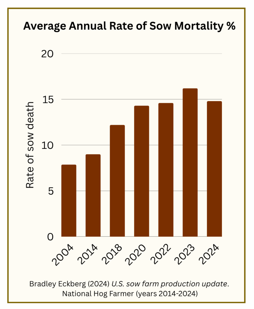 However, genetics has not increased a sow’s uterine capacity, nor her ability to provide milk for so many babies. Almost exactly in step with litter size, sow mortality is on the rise.  Industry researchers, however, seem unwilling to recognize the connection, suggesting that these increased deaths should be addressed with nutrition or further genetic manipulation. For economic reasons the efficiency gains of larger litter sizes are non-negotiable.