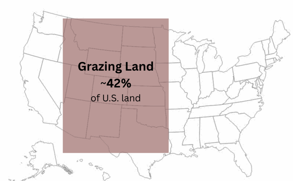 Out of total contiguous U.S. land area (~1.9 billion acres in 48 states), grazing land accounted for 803 million acres in 2017, or ~42% of contiguous U.S. land area.[1]