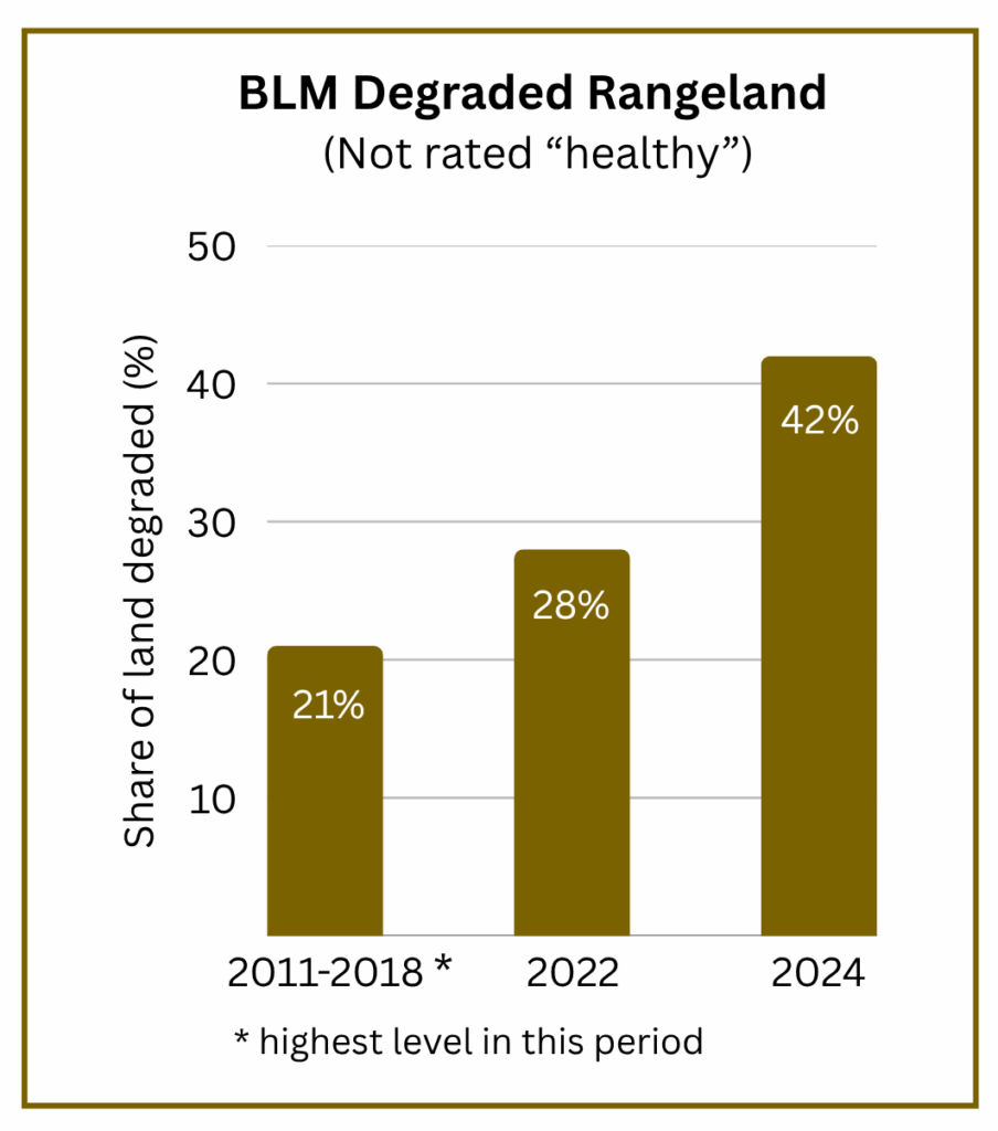 The BLM reported that 42% of all rangeland acreage was degraded in 2024.[3]