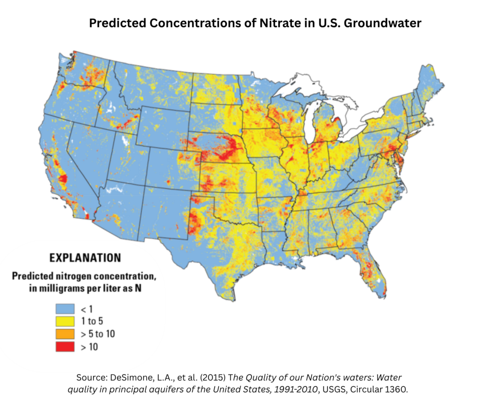 A national water quality study by the USGS estimated that 6% of private wells exceeded the 10mg/L level, with the highest nitrate concentrations in agricultural areas where “applied manure, farm fertilizer, and agricultural land use were influential predictor variables.” The study estimated that about 900,000 consumers would be affected.[5]