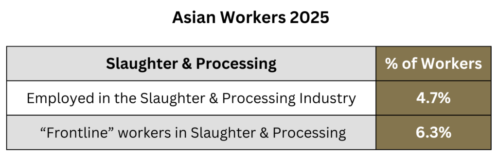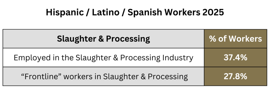 According to the Bureau of Labor Statistics, in 2025, those who identify as Hispanic, Latino, or Spanish, comprise ~37% of workers in the livestock/poultry slaughter and processing industry.[1,2] Of workers considered “frontline” by job description and duties, ~28% identify as Hispanic, Latino, or Spanish.[3,4]