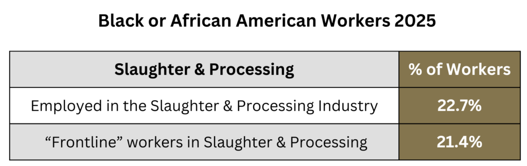According to the Bureau of Labor Statistics, in 2025, ~23% of workers in the livestock/poultry slaughter & processing industry identify as Black or African American.[1] Of workers considered “frontline” workers, ~21% identify as Black or African American.[2]