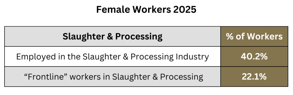 According to the Bureau of Labor Statistics, in 2025, ~40% of workers in the livestock/poultry slaughter & processing industry are women.[1,2] Of workers considered “frontline” by job description and duties, ~22% are women.[3]