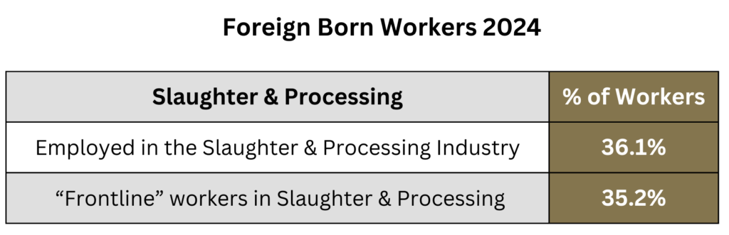 According to the U.S. Census Bureau, in 2024, ~36% of all workers in the livestock/poultry slaughter and processing industry were foreign-born.[1] Of workers considered “frontline” by job description and duties, ~35% were foreign-born.[2]