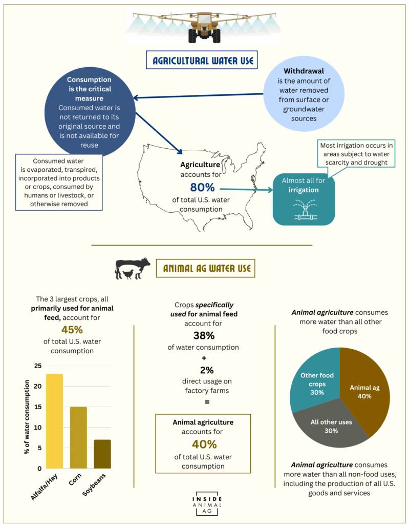 This shows some key figures for agricultural water usage and animal agriculture in particular. It focuses on water consumption, which is the critical measure of usage since water consumed does not return to its original source.